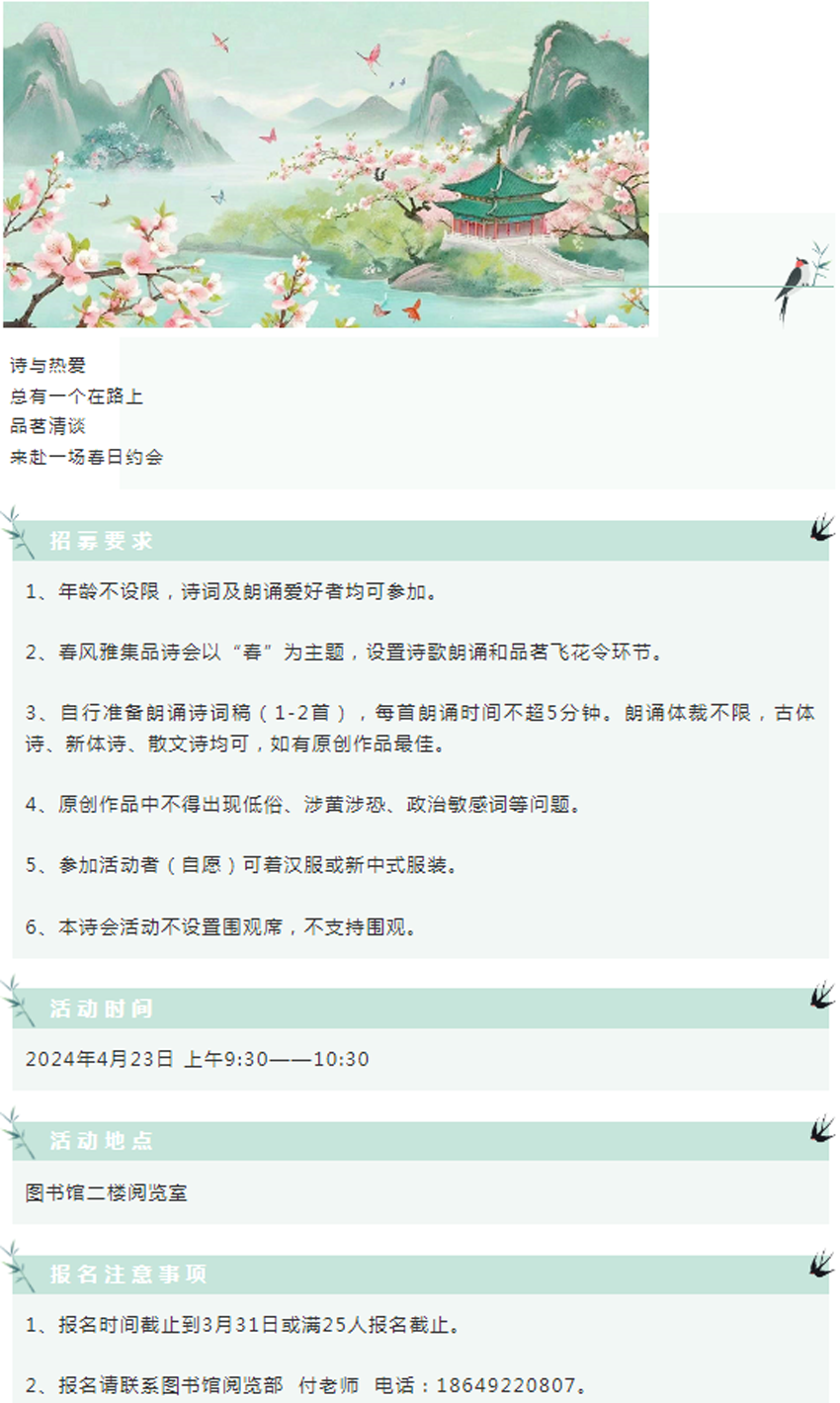 【世界读书日系列活动】| “品”春天 沐书香——东丽图书馆春风雅集品诗会招募中