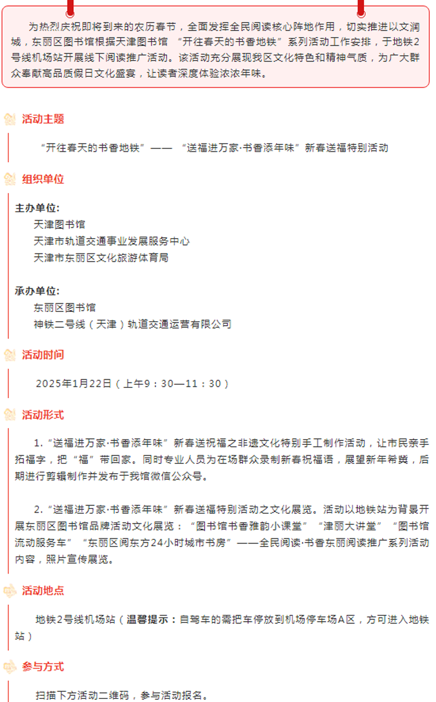 【活动通知】| “开往春天的书香地铁”——东丽区图书馆“送福进万家·书香添年味”新春送福特别活动