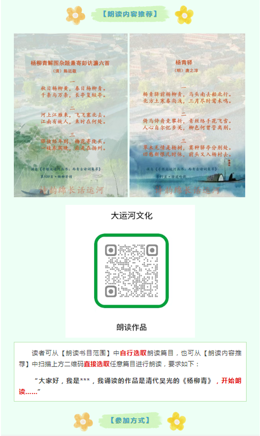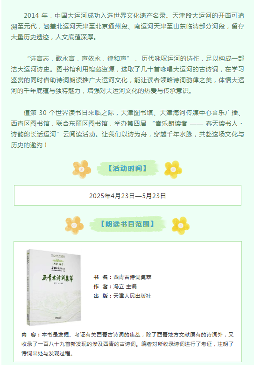 【活动通知】|我们的中国梦·文化进万家:东丽区图书馆4.23系列活动之第四届“音乐朗读者 春天读书人·诗韵绵长话运河”云阅读活动