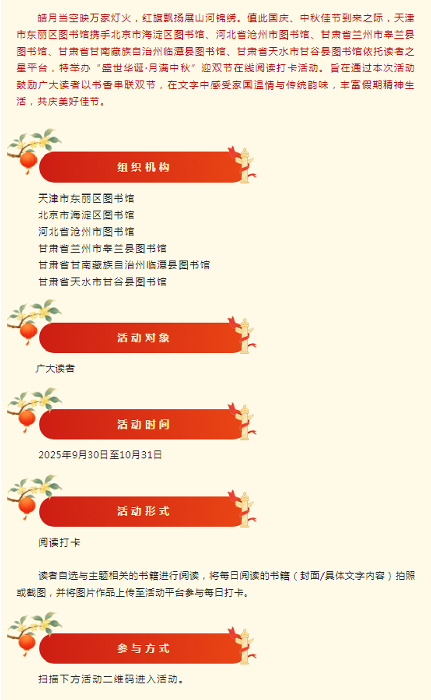 【活动通知】| “盛世华诞·月满中秋”——津京冀甘四地迎双节在线阅读打卡活动