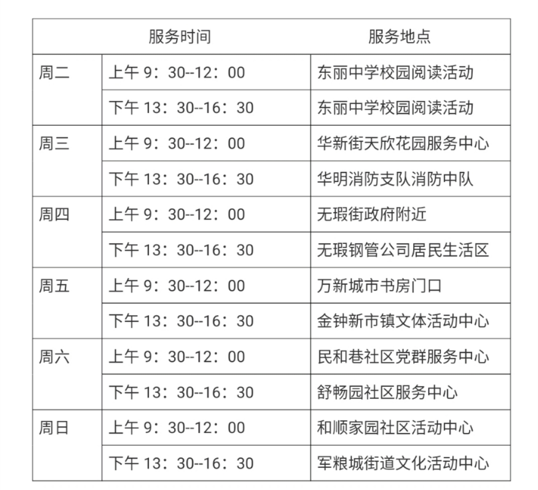 9月29日—10月4日流动图书车服务时间地点公布如下,如有社区、单位需要图书车上门服务请与杜俊老师联系,联系电话:18522291388。