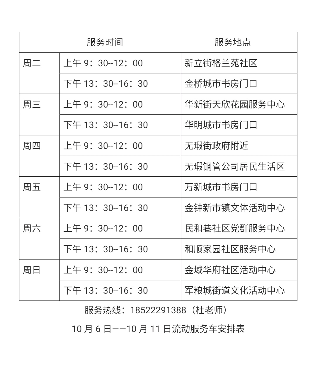 东丽区图书馆流动服务车服务时间地点(10月6日—10月11日)