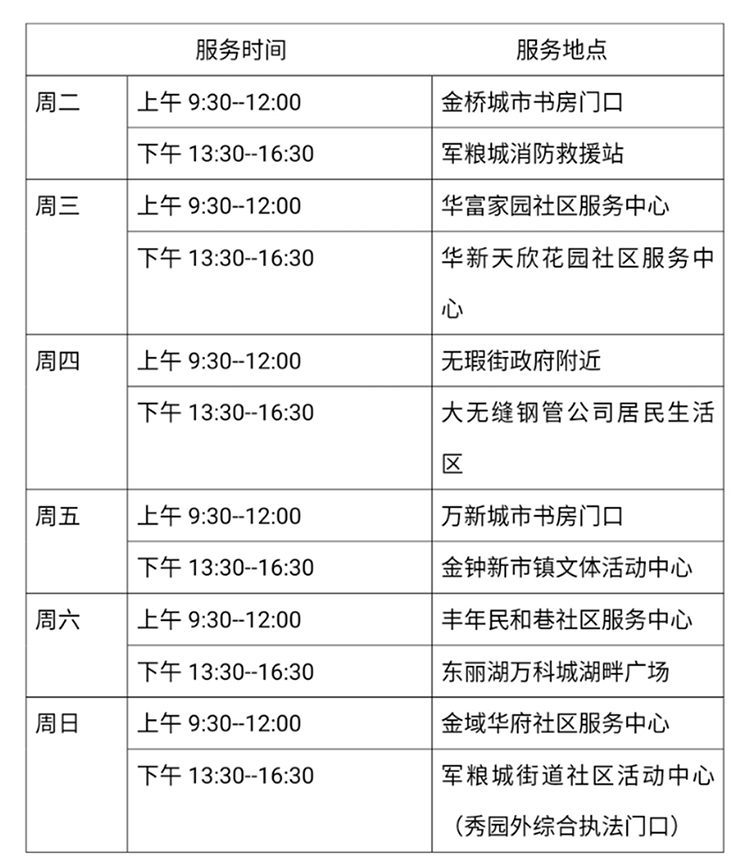 1月26日—1月31日流动图书车服务时间地点公布如下,如有社区、单位需要图书车上门服务请与杜俊老师联系,联系电话:18522291388。