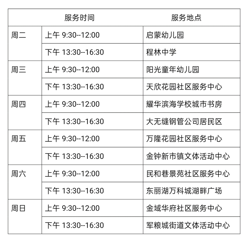 6月22日—6月27日流动图书车服务时间地点公布如下,如有社区、单位需要图书车上门服务请与杜俊老师联系,联系电话:18522291388。