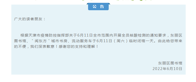 东丽区图书馆、"阅东方"城市书房和流动服务车闭馆公告