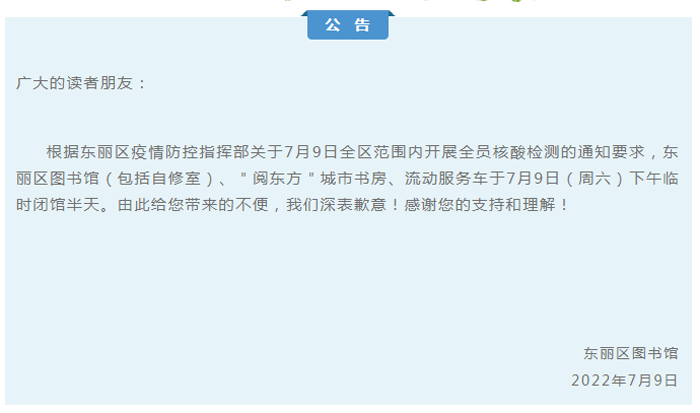 东丽区图书馆、"阅东方"城市书房和流动服务车闭馆公告