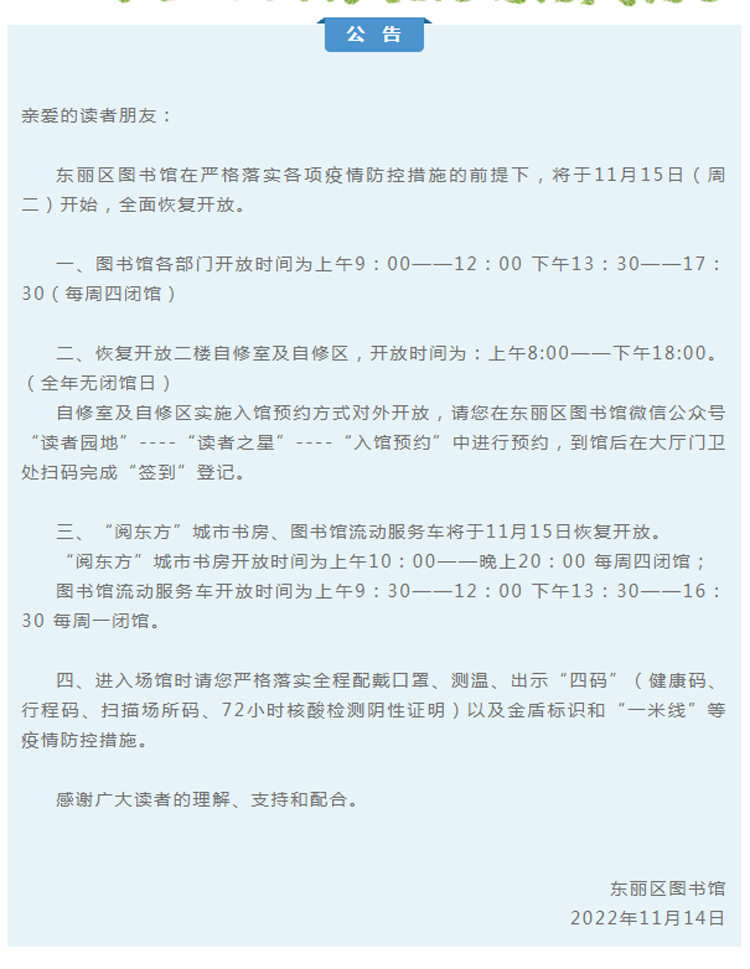 东丽区图书馆恢复开馆公告