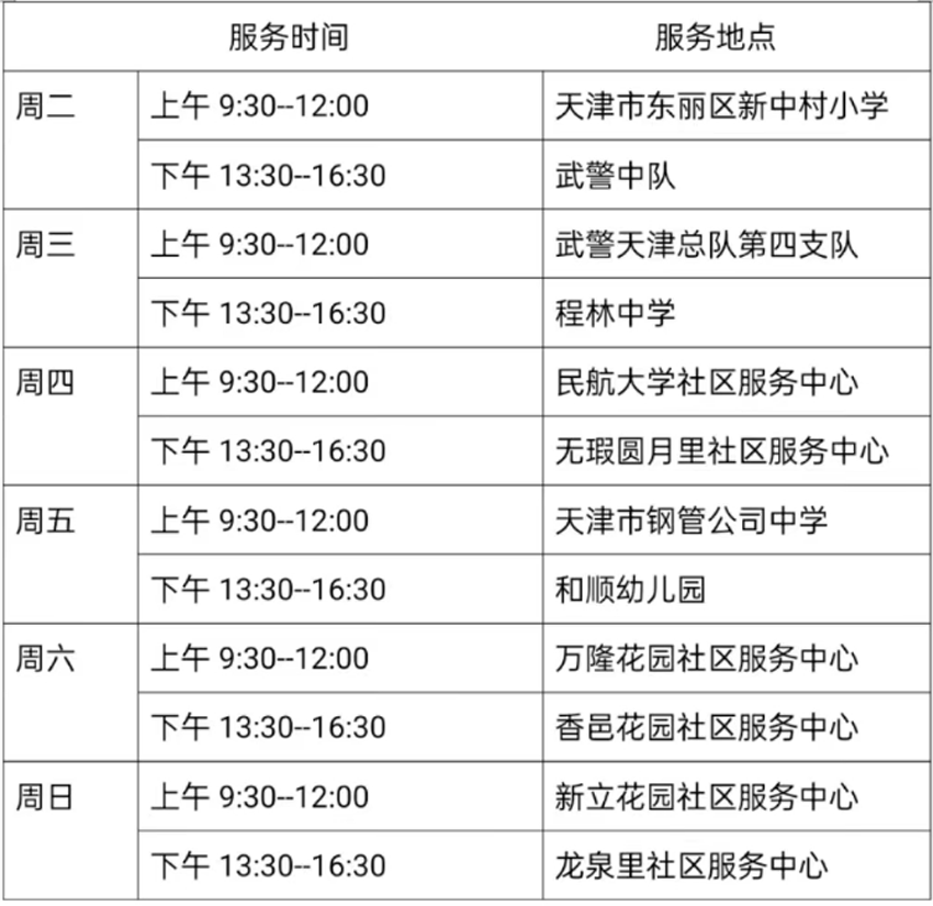 5月23日—5月28日东丽区图书馆流动服务车服务时间地点公布如下。社区、单位需要服务车上门服务请与杜俊老师联系,联系电话:18522291388。