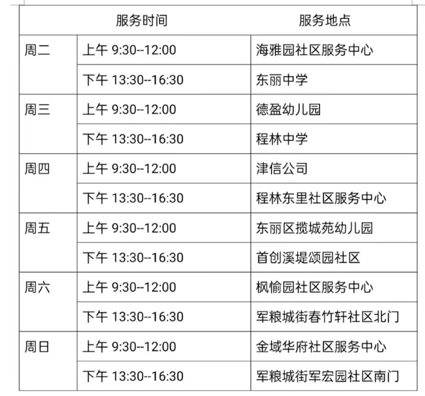 6月6日—6月11日东丽区图书馆流动服务车服务时间地点公布如下。社区、单位需要服务车上门服务请与杜俊老师联系,联系电话:18522291388。