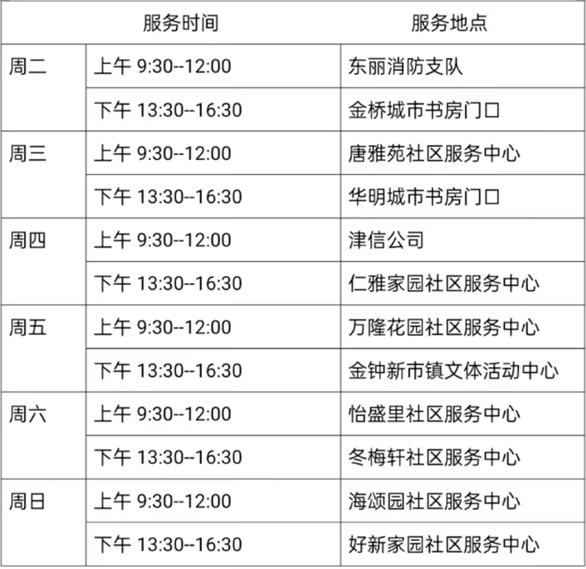 8月8日—8月13日东丽区图书馆流动服务车服务时间地点公布如下。社区、单位需要服务车上门服务请与杜俊老师联系,联系电话:18522291388。