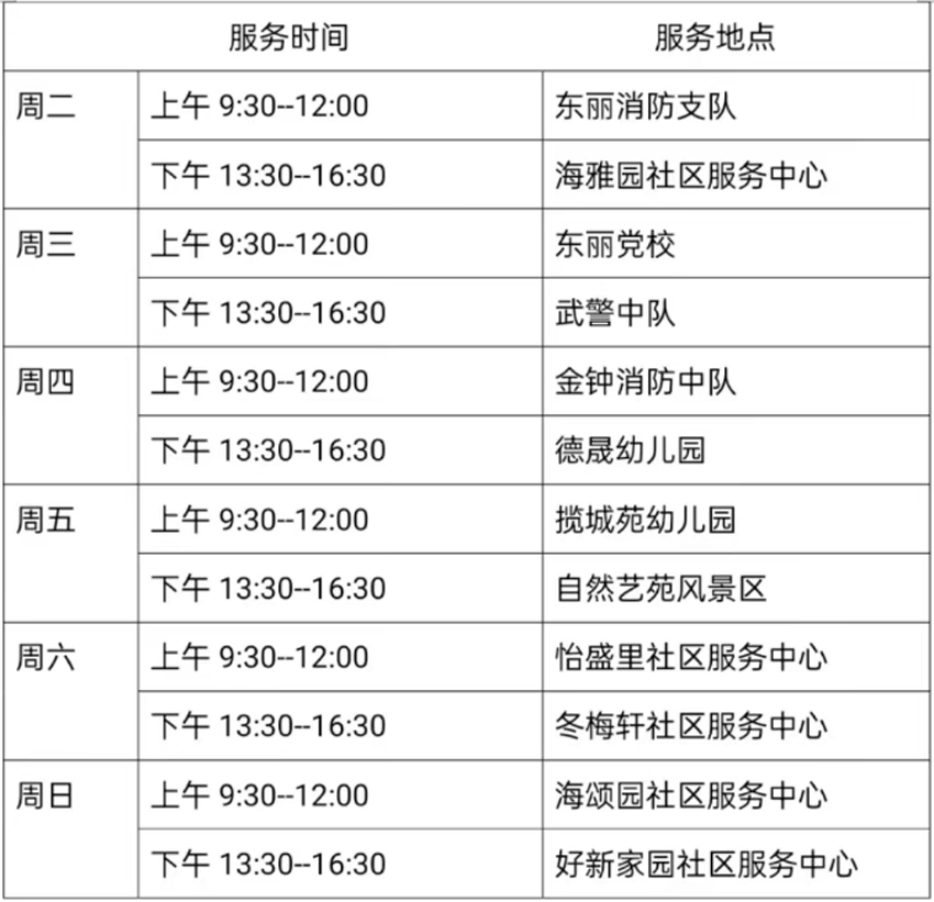 9月5日—9月10日东丽区图书馆流动服务车服务时间地点公布如下。社区、单位需要服务车上门服务请与杜俊老师联系,联系电话:18522291388。