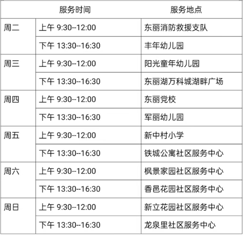 12月5日—12月10日东丽区图书馆流动服务车服务时间地点公布如下。社区、单位需要服务车上门服务请与杜俊老师联系,联系电话:18522291388。
