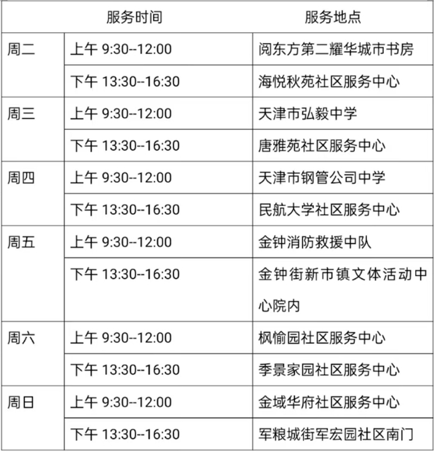 12月19日—12月24日东丽区图书馆流动服务车服务时间地点公布如下。社区、单位需要服务车上门服务请与杜俊老师联系,联系电话:18522291388。