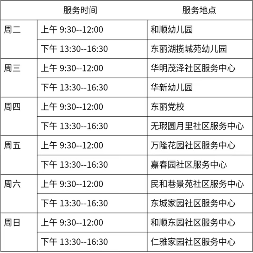 1月9日—1月14日东丽区图书馆流动服务车服务时间地点公布如下。社区、单位需要服务车上门服务请与杜俊老师联系,联系电话:18522291388。