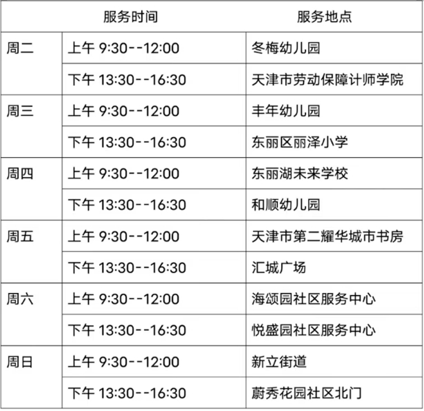 4月16日—4月21日东丽区图书馆流动服务车服务时间地点公布如下。社区、单位需要服务车上门服务请与杜俊老师联系,联系电话:18522291388。