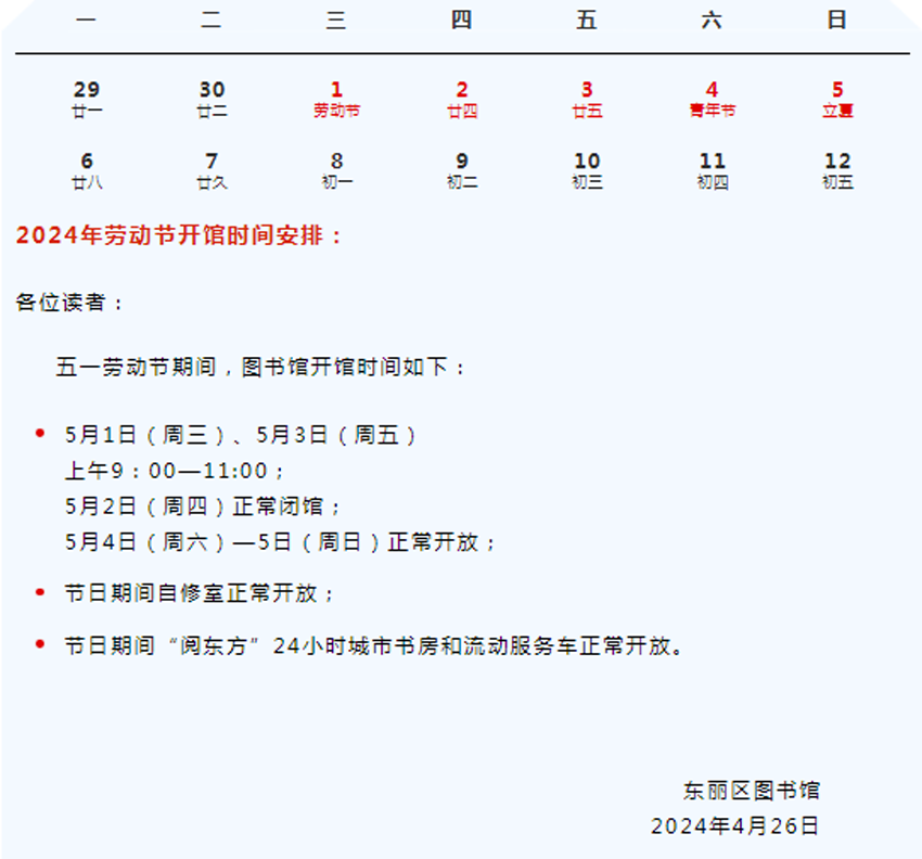 2024年东丽区图书馆劳动节开馆时间安排