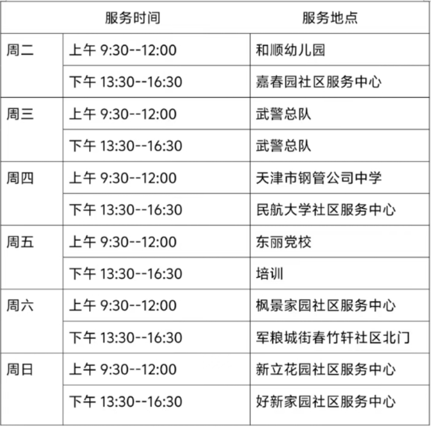 10月8日—10月13日东丽区图书馆流动服务车服务时间地点公布如下。社区、单位需要服务车上门服务请与杜俊老师联系,联系电话:18522291388。