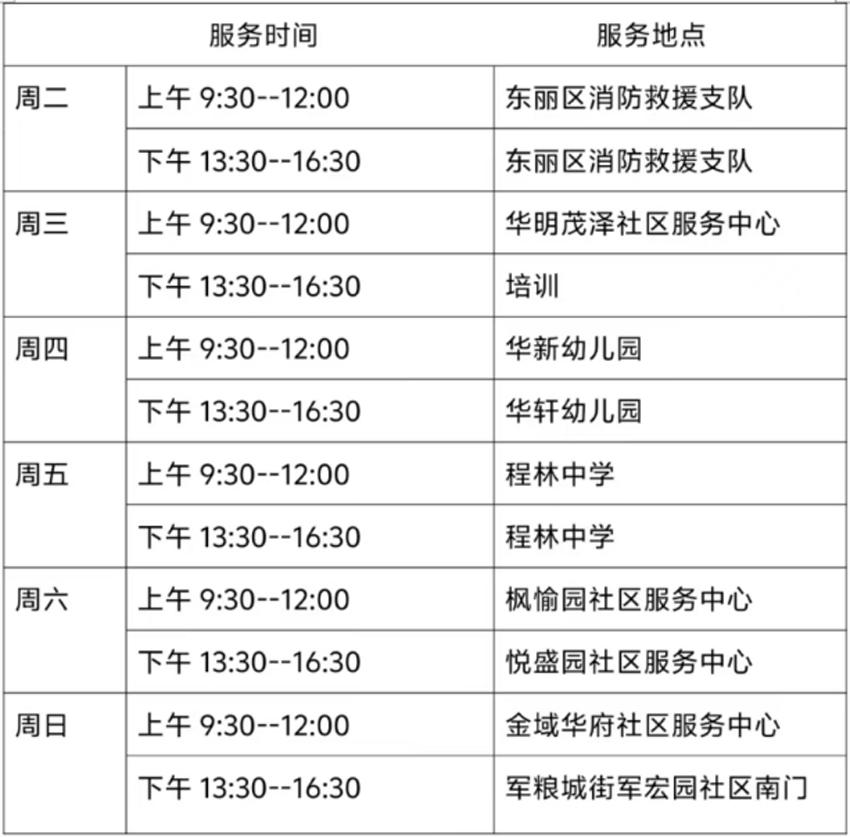 10月22日—10月27日东丽区图书馆流动服务车服务时间地点公布如下。社区、单位需要服务车上门服务请与杜俊老师联系,联系电话:18522291388。