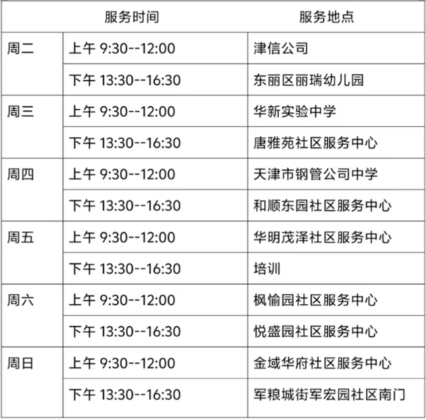 11月19日—11月24日东丽区图书馆流动服务车服务时间地点公布如下。社区、单位需要服务车上门服务请与杜俊老师联系,联系电话:18522291388。