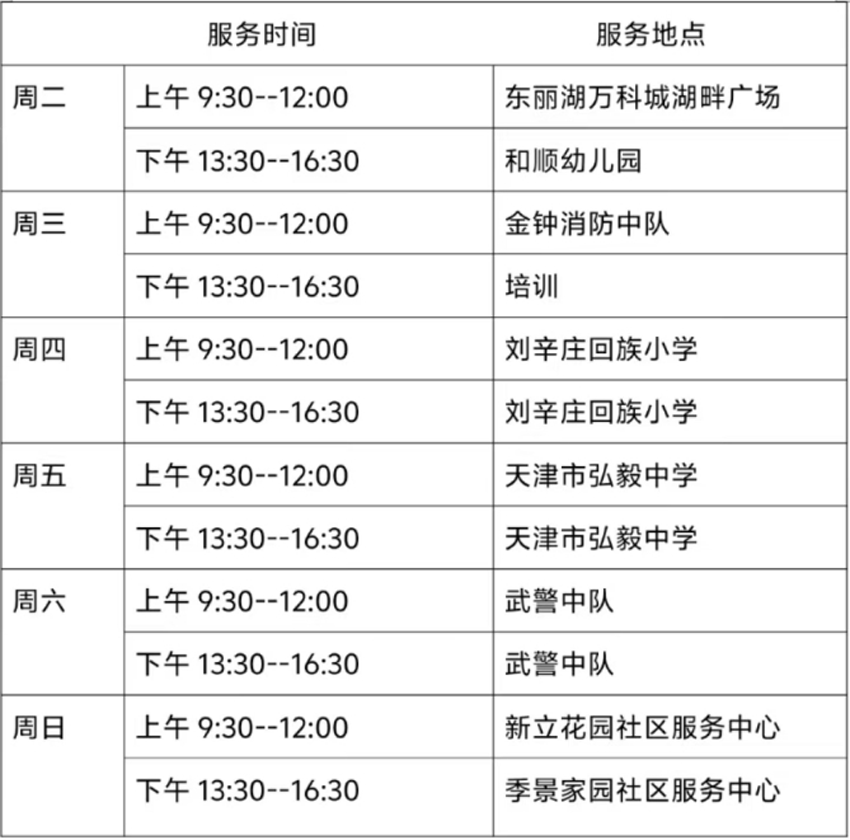 12月31日—1月5日东丽区图书馆流动服务车服务时间地点公布如下。社区、单位需要服务车上门服务请与杜俊老师联系,联系电话:18522291388。