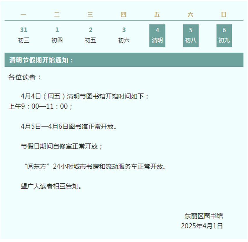 【开馆通知】| 2025年东丽区图书馆清明节开馆时间安排