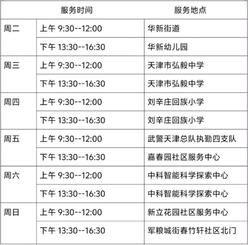 4月22日—4月27日东丽区图书馆流动服务车服务时间地点公布如下。社区、单位需要服务车上门服务请与杜俊老师联系,联系电话:18522291388。