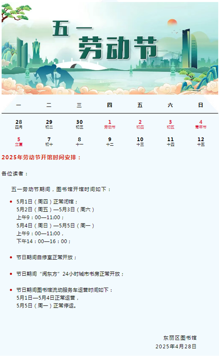 【开馆通知】| 2025年东丽区图书馆劳动节开馆时间安排