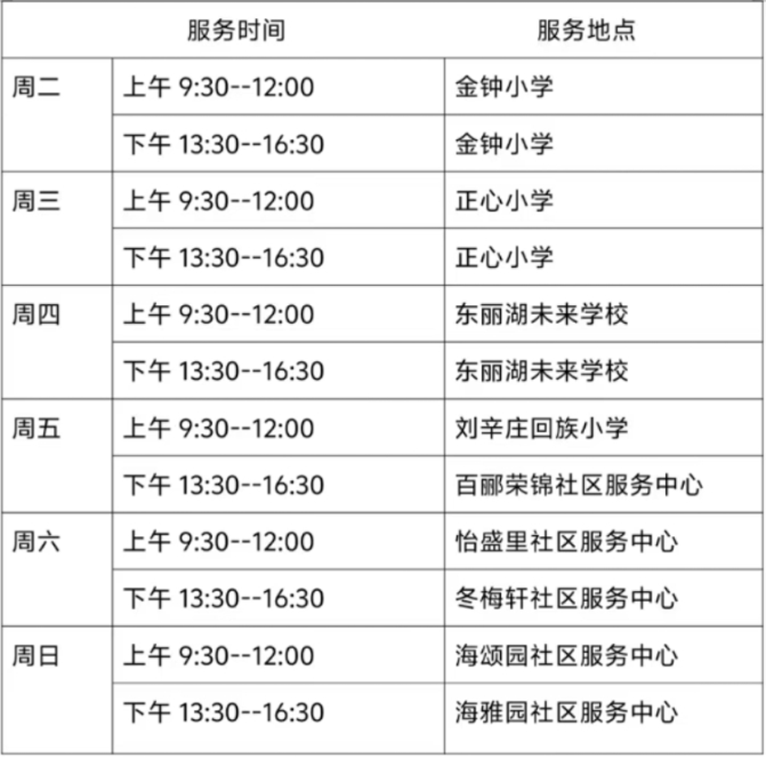 6月10日—6月15日东丽区图书馆流动服务车服务时间地点公布如下。社区、单位需要服务车上门服务请与杜俊老师联系,联系电话:18522291388。