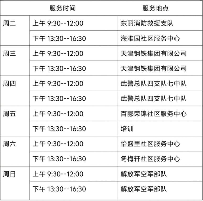 8月5日—8月10日东丽区图书馆流动服务车服务时间地点公布如下。社区、单位需要服务车上门服务请与杜俊老师联系,联系电话:18522291388。