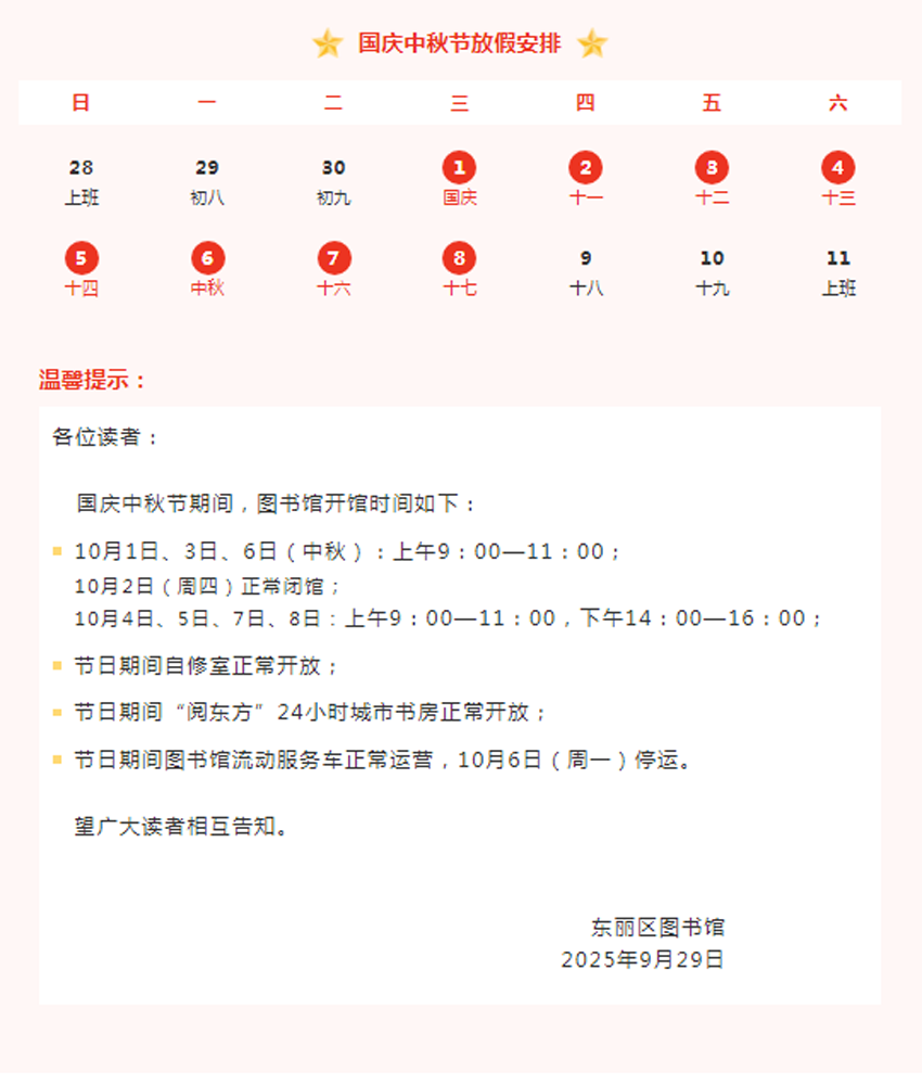 2025年东丽区图书馆中秋国庆期间开馆时间安排