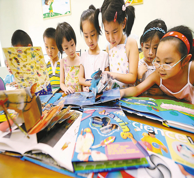 7月29日,南京一家公益性少儿英文图书馆在金陵图书馆开馆,这是我省首家以少年儿童为对象的全英文图书馆,该馆现有馆藏原版英文读物5700册,全部是由美国明德图书馆基金会无偿捐赠的。图为小读者在英文图书馆阅览英文图书。