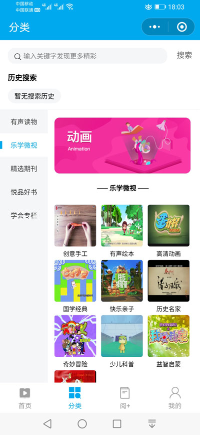 资源丰富涉及面广:涵盖文学历史、政治军事、经管科技、生活、少儿等等,从幼儿到老年人都能在该平台找到适合的阅读资源,特别针对宅在家的青少年儿童群体,平台乐视微学版块有创意手工、有声绘本、高清动画、国学经典、少儿科普、益智启蒙等视频资源,满足青少年儿童的学习需求。