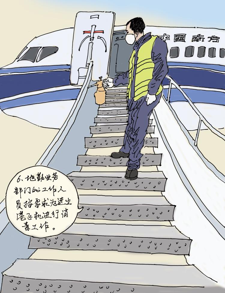 地勤业务部门的工作人员按要求为进出港飞机进行消毒工作。