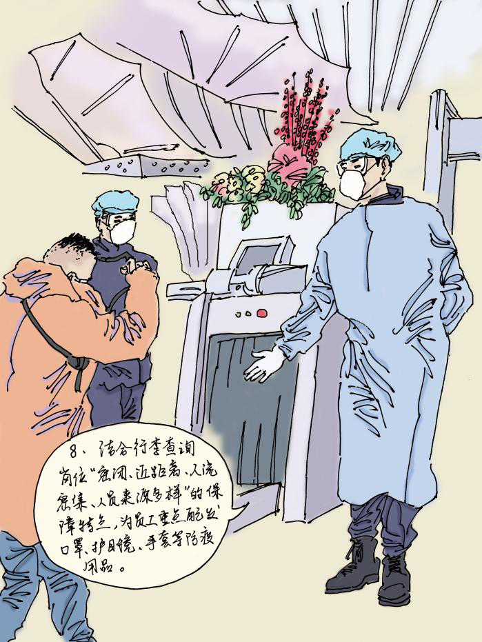 结合行李查询岗位“密闭、近距离、人流密集、人员来源多样”的保障特点,为员工重点配发口罩、护目镜、手套等防疫用品。