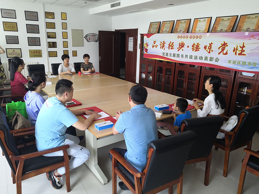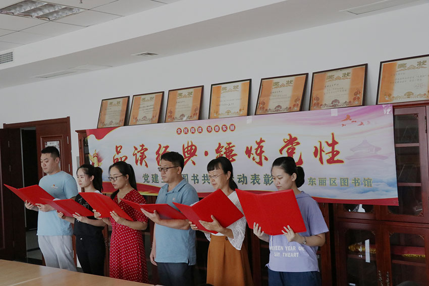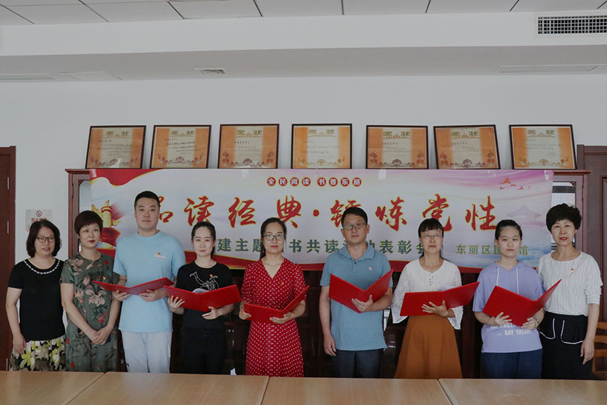 7月22日上午,东丽区图书馆五楼荣誉展室内,伴随着六位获奖者集体朗诵《共产党宣言》,“品读经典 锤炼党性”——党建主题图书共读活动表彰会拉开了帷幕。