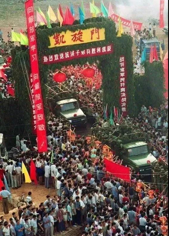 部队撤的那天,天空下着蒙蒙细雨,但九江老百姓都自发地前来送行,他们给自己的子弟兵扎了一个大大的“凯旋门”。