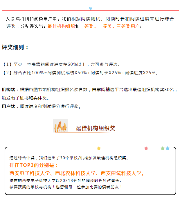 秋风送爽,金桂飘香,秋季是收获和充实的季节,本次掌阅精选与各机构图书馆联合举办的“秋季读后测试大赛”也在硕果累累中落下了帷幕。 在8月15日至9月15日这一个月的招募期和参赛期中,共有54家机构报名;总阅读时长长达76413分钟;总计参与人数达到405人; 参与测试的总计得分19945分;总计参与人数269人;满分人数69人。