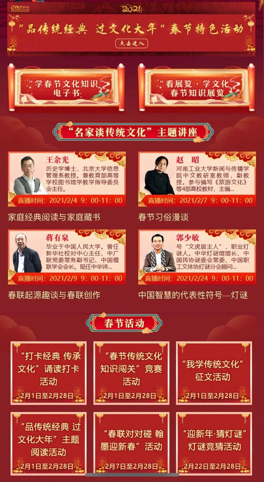 在2月1日-2月28日期间,中国知网联合全国部分公共文化机构推出一系列丰富多样的线上传统文化活动,通过《中华优秀传统文化春节主题知识服务平台》可一键进入各项活动页面,让您的春节过的有滋有味有文化。