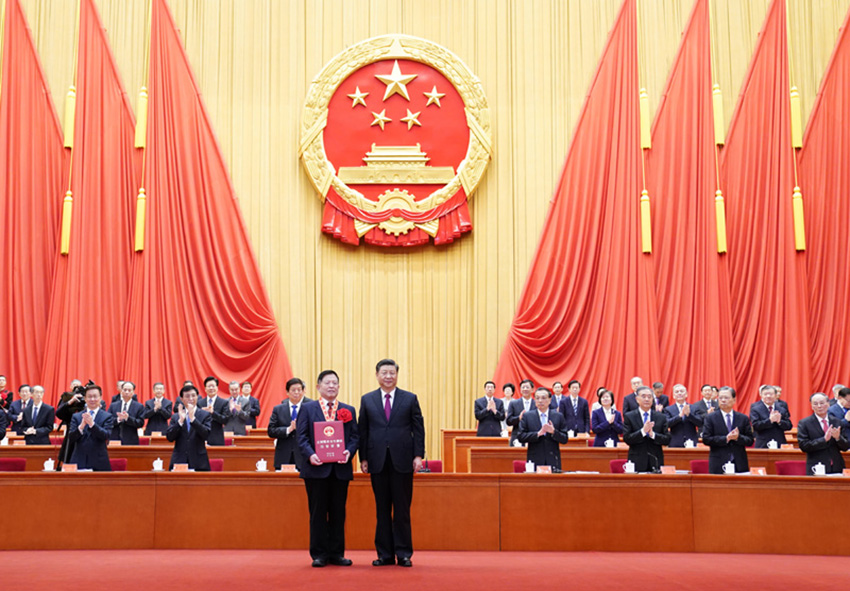 2月25日,全国脱贫攻坚总结表彰大会在北京人民大会堂隆重举行。这是习近平为全国脱贫攻坚楷模荣誉称号获得者四川省凉山彝族自治州昭觉县三岔河镇三河村颁奖。新华社记者 燕雁 摄