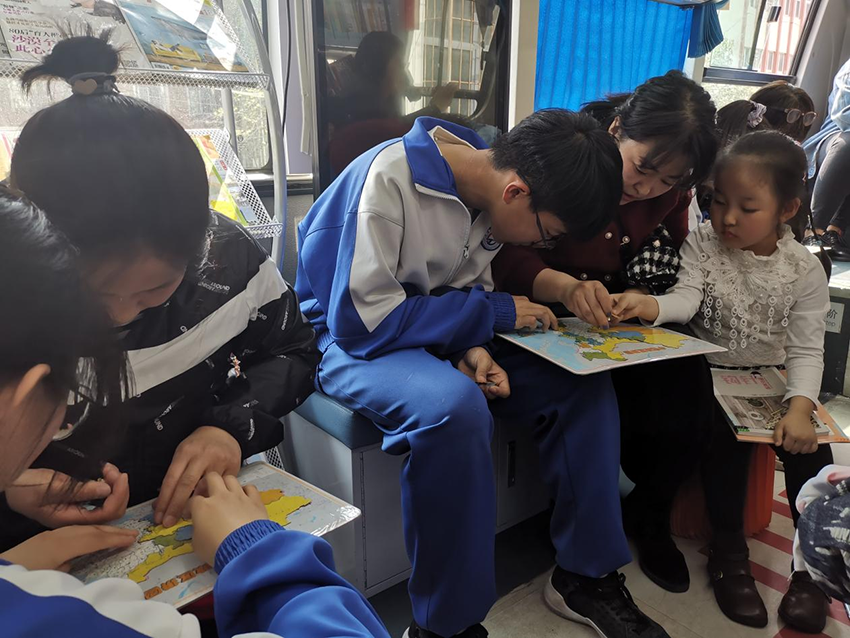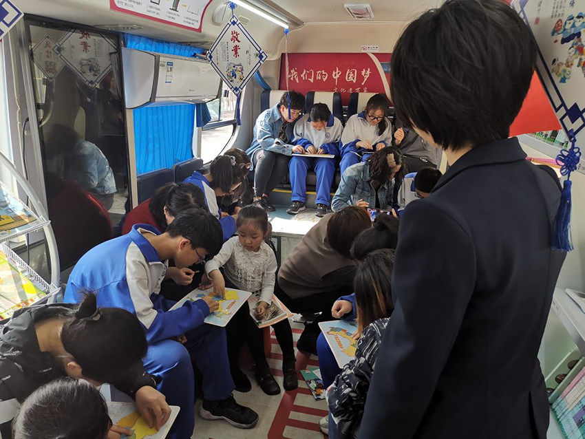 流动服务车不仅把图书资源带进校园,还带来了“书香里遇到你 亲子共读”活动。在图书车上,同学们和家长一起参加了亲子互动游戏。刘容禾老师给家长们解答青春期孩子沟通的困惑;又帮助家长和孩子们选择适合的书籍。
