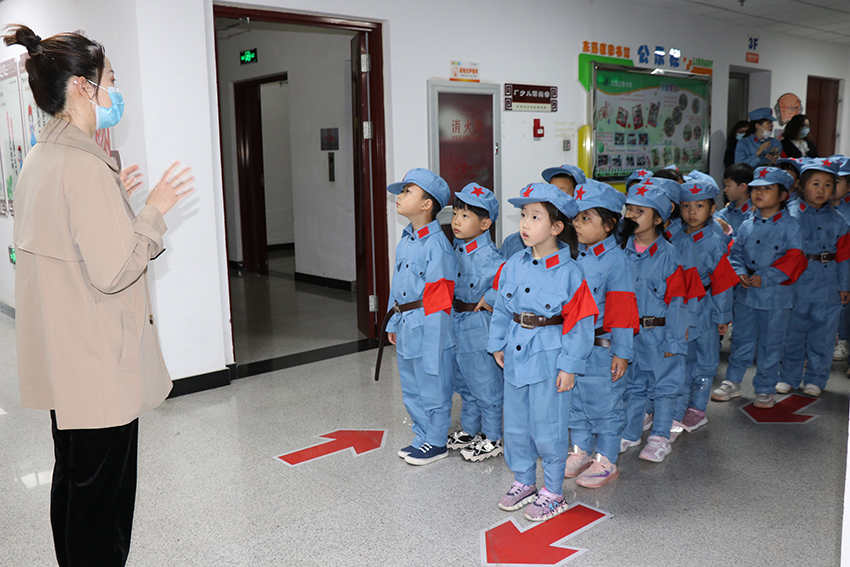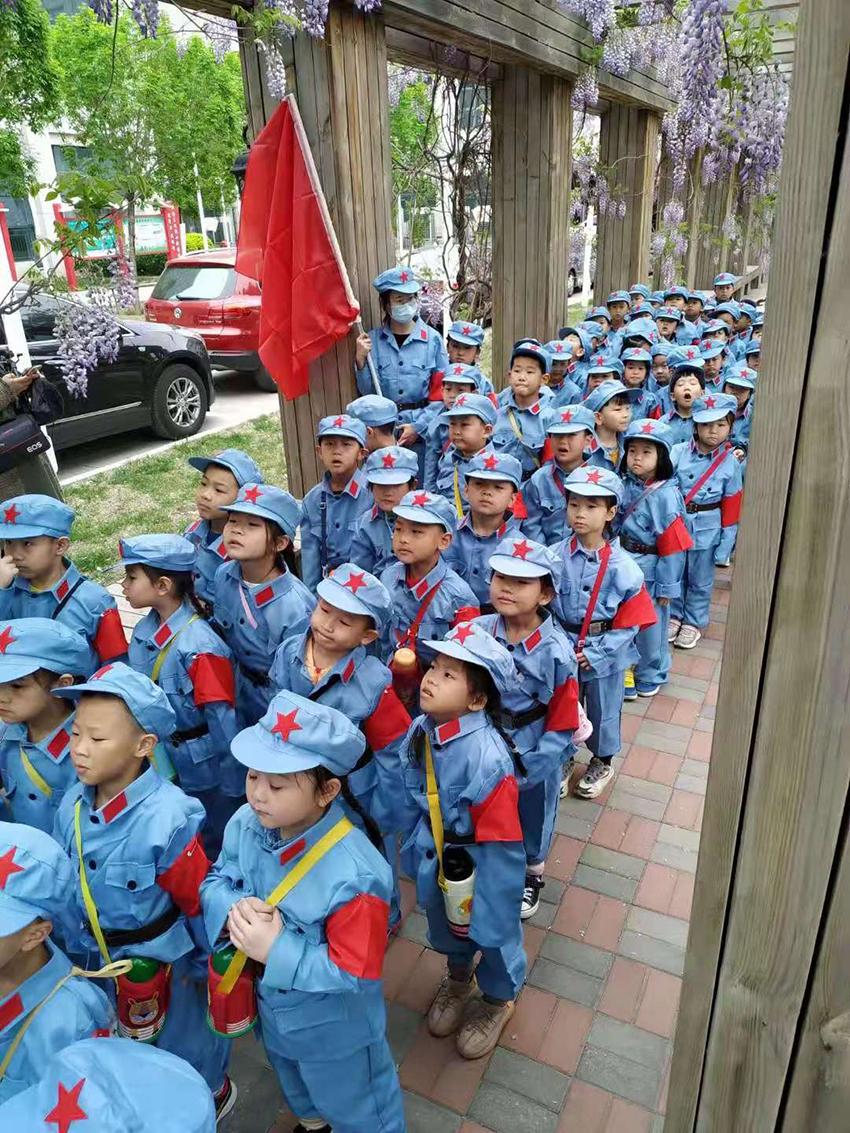 在紫藤花架下,穿红军服的孩子们的小脑袋簇在一起,岳立春副馆长对他们的到来表示热烈欢迎,随即介绍了今天的活动流程。