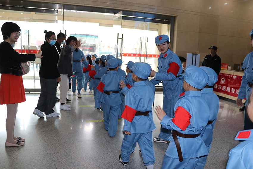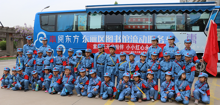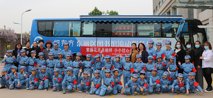 4月26日上午,早早地,图书馆领导和老师们就来到大门口迎接丰年幼儿园的孩子们,开启今天的红色书香之旅。
