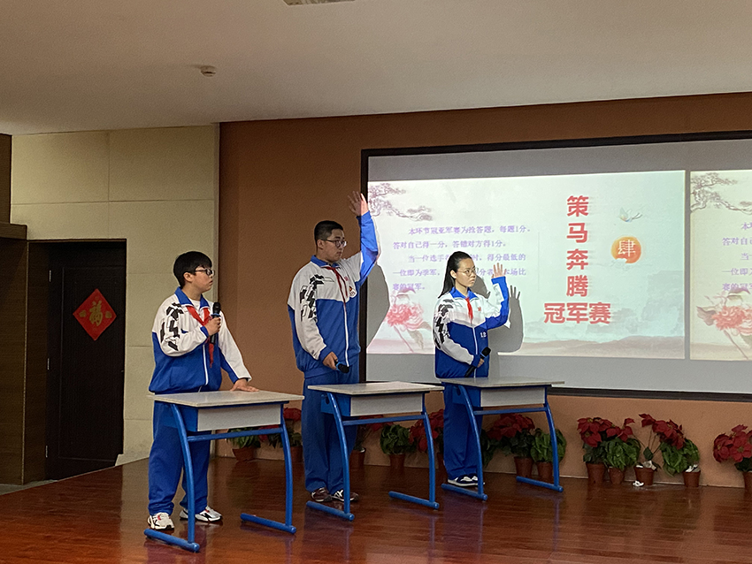 选手们沉着冷静、积极抢答;回答有条不紊、逻辑清晰;竞赛你追我赶,难分伯仲。经过紧张激烈的比赛,最终初一6班吴一凡同学以优异表现获得冠军,3班张奚宁和10班的李释毅同学分获亚军和季军。初一6班、3班和10班分获团体前三名。