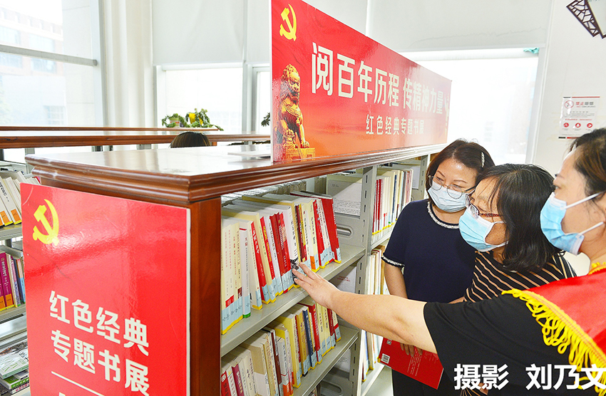 图为东丽区图书馆在二楼通借通还室设立的“阅百年历程 传精神力量”红色经典专题书展,读者纷纷借阅学习。