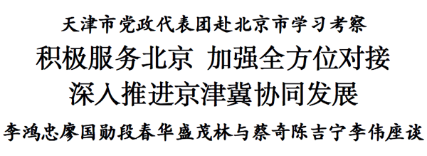 本报讯(记者 魏彧 于春沣)16日,天津市党政代表团赴北京市学习考察,深入贯彻落实习近平总书记关于京津冀协同发展一系列重要讲话和重要指示批示精神,坚决落实党中央、国务院决策部署,推动两市合作交流、协同发展取得新成效。市委书记李鸿忠,市委副书记、市长廖国勋,市人大常委会主任段春华,市政协主席盛茂林与北京市委书记蔡奇,市委副书记、市长陈吉宁,市人大常委会主任李伟座谈。