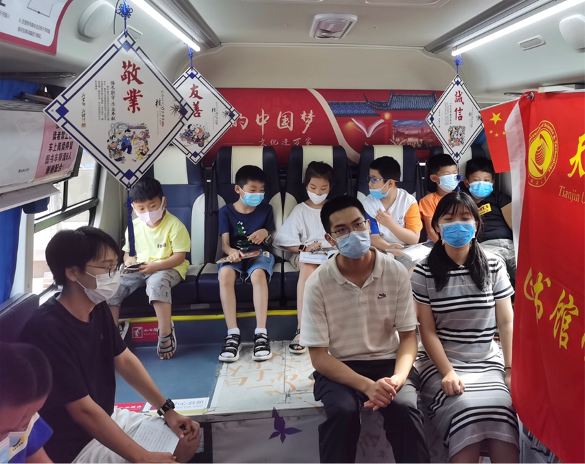 在流动服务车上,天津科技大学的李姝均同学带领小朋友们阅读绘本故事,以著名科学家南仁东为例,鼓励小朋友们要努力学习科学文化知识,立志报效祖国。