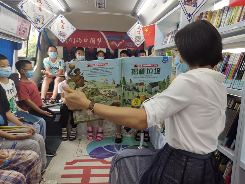 在流动服务车上,刘容禾老师和小读者们一起分享了图书《解密垃圾分类》,为小读者们科普垃圾分类知识。