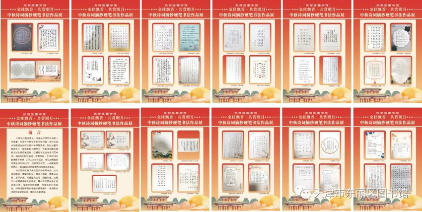 东丽区图书馆“金桂飘香·共赏明月”中秋诗词摘抄硬笔书法作品征集活动结束后,优秀作品被制作成专题展览。