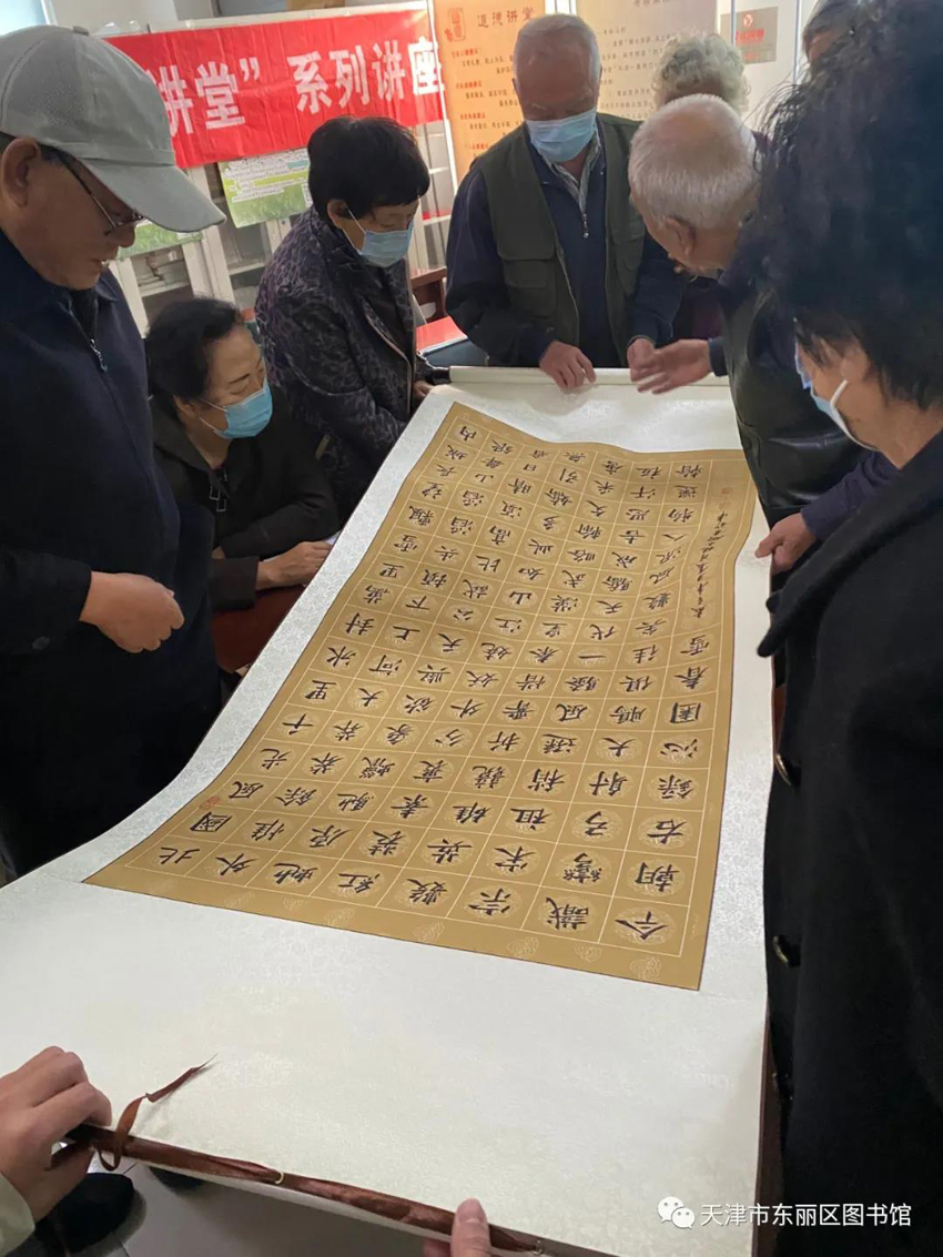 现场杨玉碑老师还拿出自己的书法作品与大家交流经验,得到书法爱好者们的一致赞扬,讲座结束后大家热情的邀请杨老师来到丰年里社区书画社,进行更深入的交流和学习并合影留念。