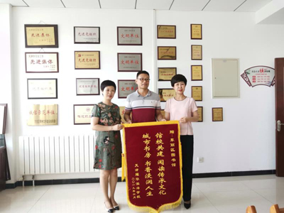 最后,吕家华校长代表耀华滨海学校向区总馆赠送了“馆校共建 阅读传承文化 城市书房 书香浸润人生”锦旗,对区总馆给与耀华滨海学校书香校园建设的大力支持表示感谢,我馆曹振玲、岳立春副馆长代表总馆接受了锦旗。